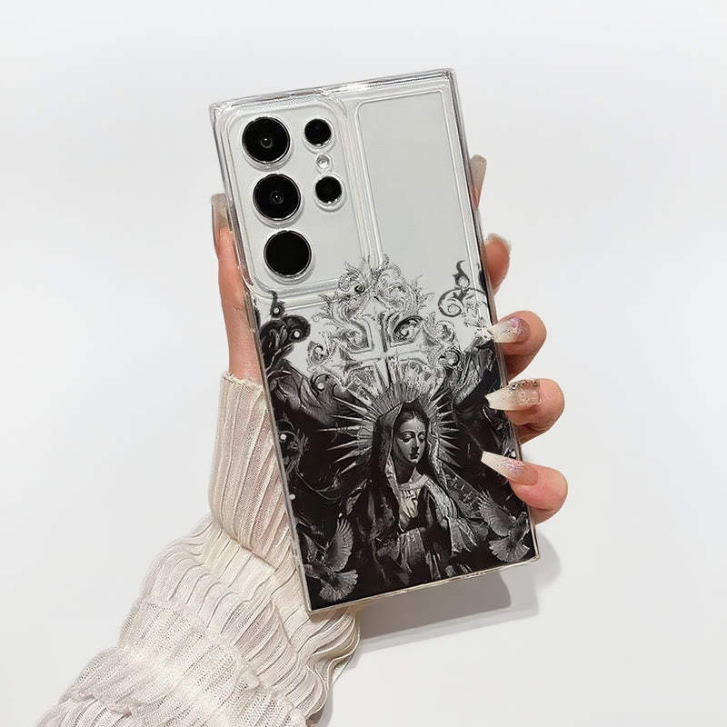 This gothic-style protective phone case features the sacred image of Our Lady, a timeless symbol of compassion, guidance, and maternal protection.