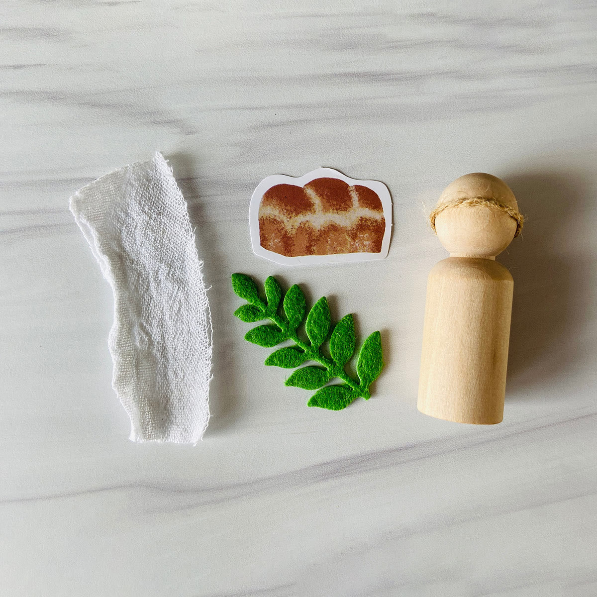 • Include: Box (3.5 x 3.5 x 1 inch), wooden peg doll (2 3/8 inches), felt palm branch, white cotton cloth, hemp cord, loaf of bread cut out, 7 cards