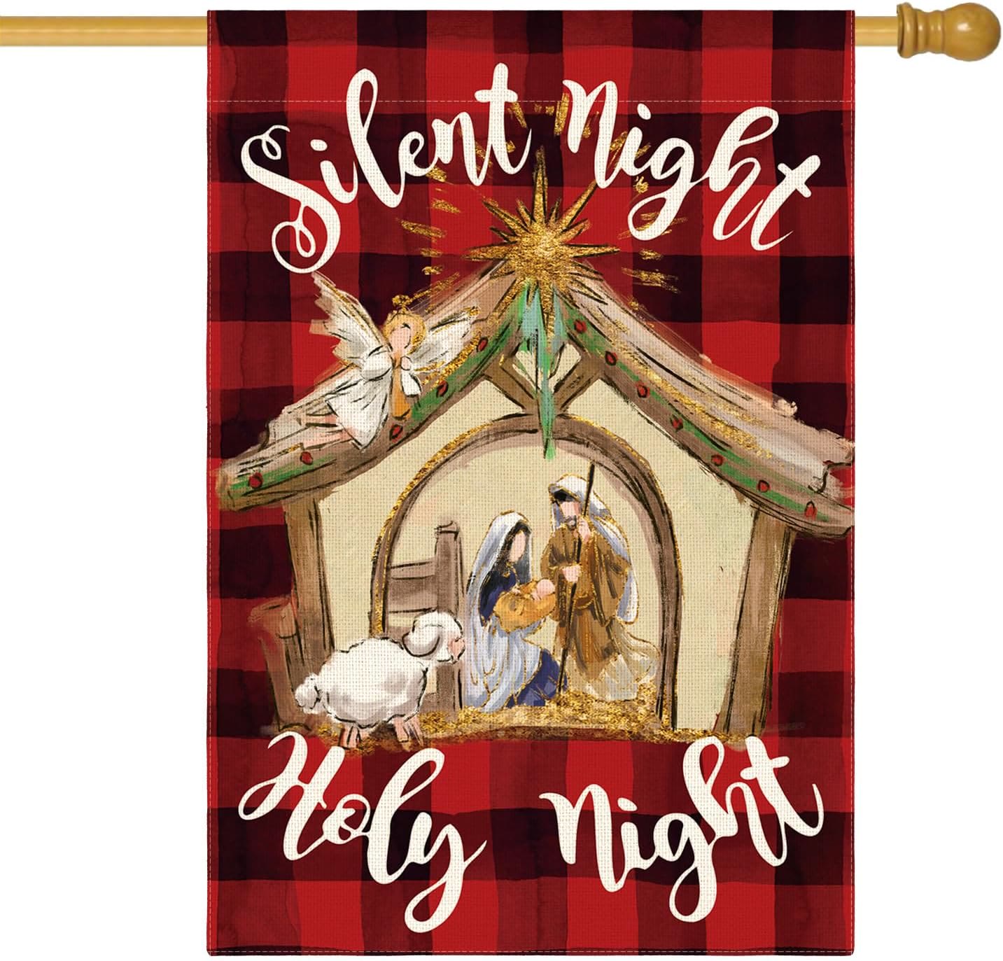 Celebrate the sacred beauty of Christmas with this exquisitely designed garden flag, featuring the beloved Nativity scene—complete with the Holy Family, a gentle lamb, and an angel—set against a classic red - black Buffalo plaid backdrop and paired with the timeless phrase “Silent Night Holy Night”. -