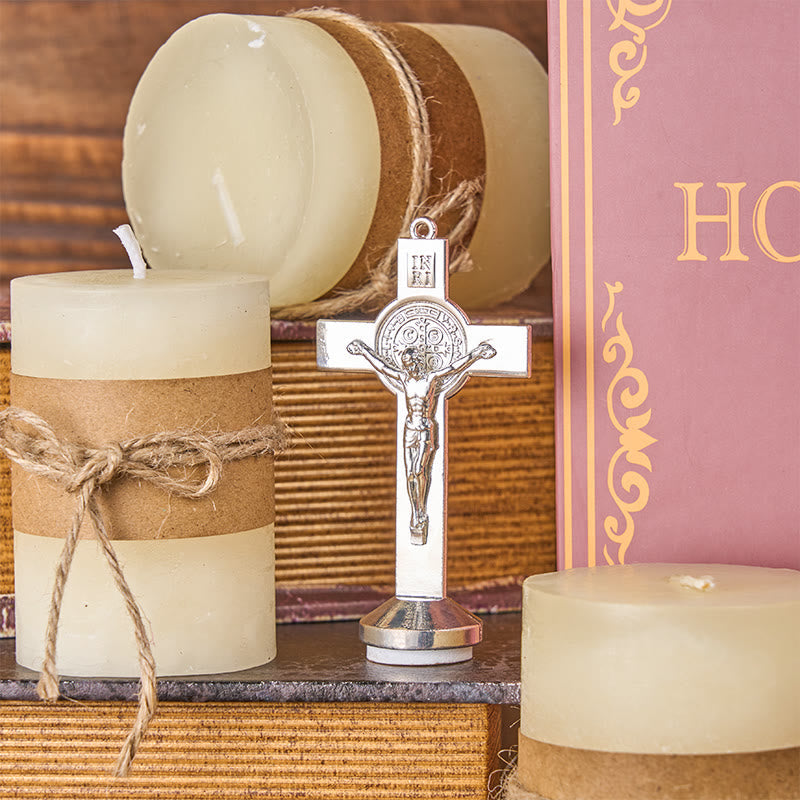 The Sacred Symbols Tabletop Crucifix symbolizes sacrifice, redemption, and unwavering faith. The addition of the St. Benedict Medal amplifies its significance as a beacon of spiritual protection and grace.