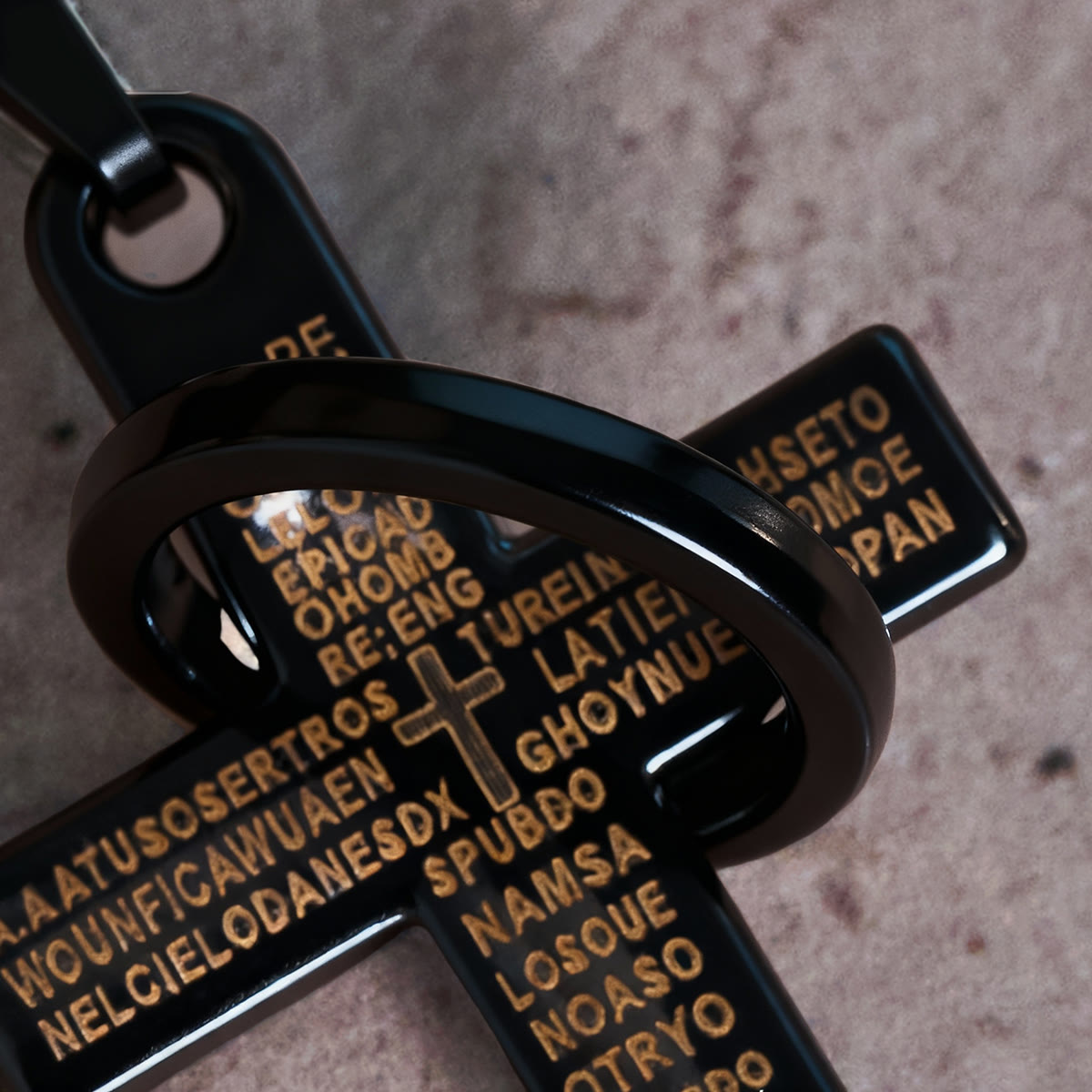 A modern chain holds a cross engraved with the Lord’s Prayer and an interlocking ring that embraces it—style that wears your belief out loud.