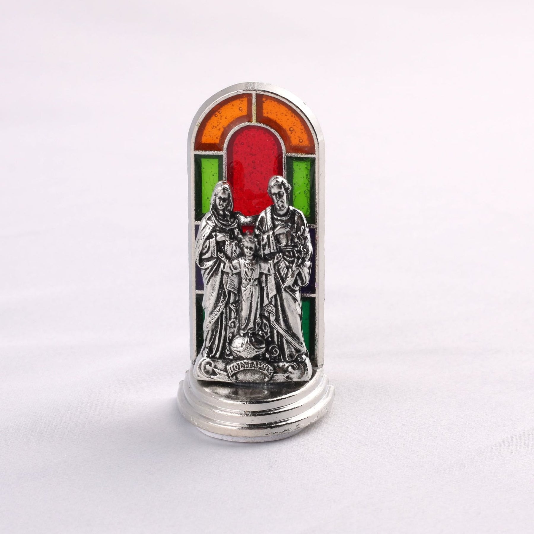 Each statue features a silver - toned figure of a revered Christian icon, whether it's Jesus, Mary, or an angel, set against a backdrop reminiscent of stained - glass windows. In Christian art, stained - glass windows often tell biblical stories and represent the light of God. The vibrant colors of red, green, blue, and purple symbolize different aspects of the divine: red for the blood of Christ and His sacrifice, green for new life and growth in faith, blue for the heavens and divine peace, and purple for royalty and the majesty of God. -