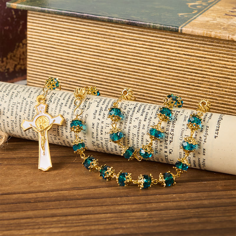 Our rosary features distinctive green glass beads, symbolizing tranquility and protection in your faith journey. The natural tones of the glass beads add a unique and uplifting dimension to your prayers. The cool texture of the beads feels comforting in your hands, enriching your prayer experience with their natural beauty.
