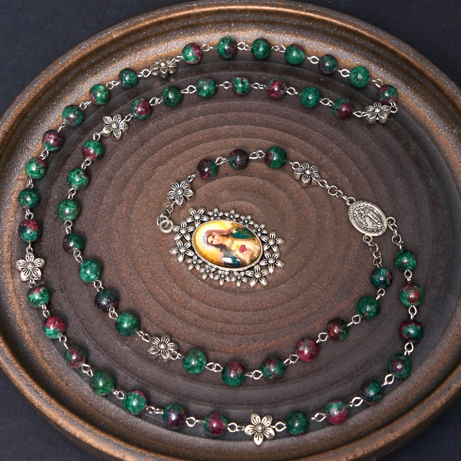Christianartworkshop Our Lady of Fátima & Immaculate Heart of Mary of 8 mm Round Green Natural Stone Alloy Chain Rosary