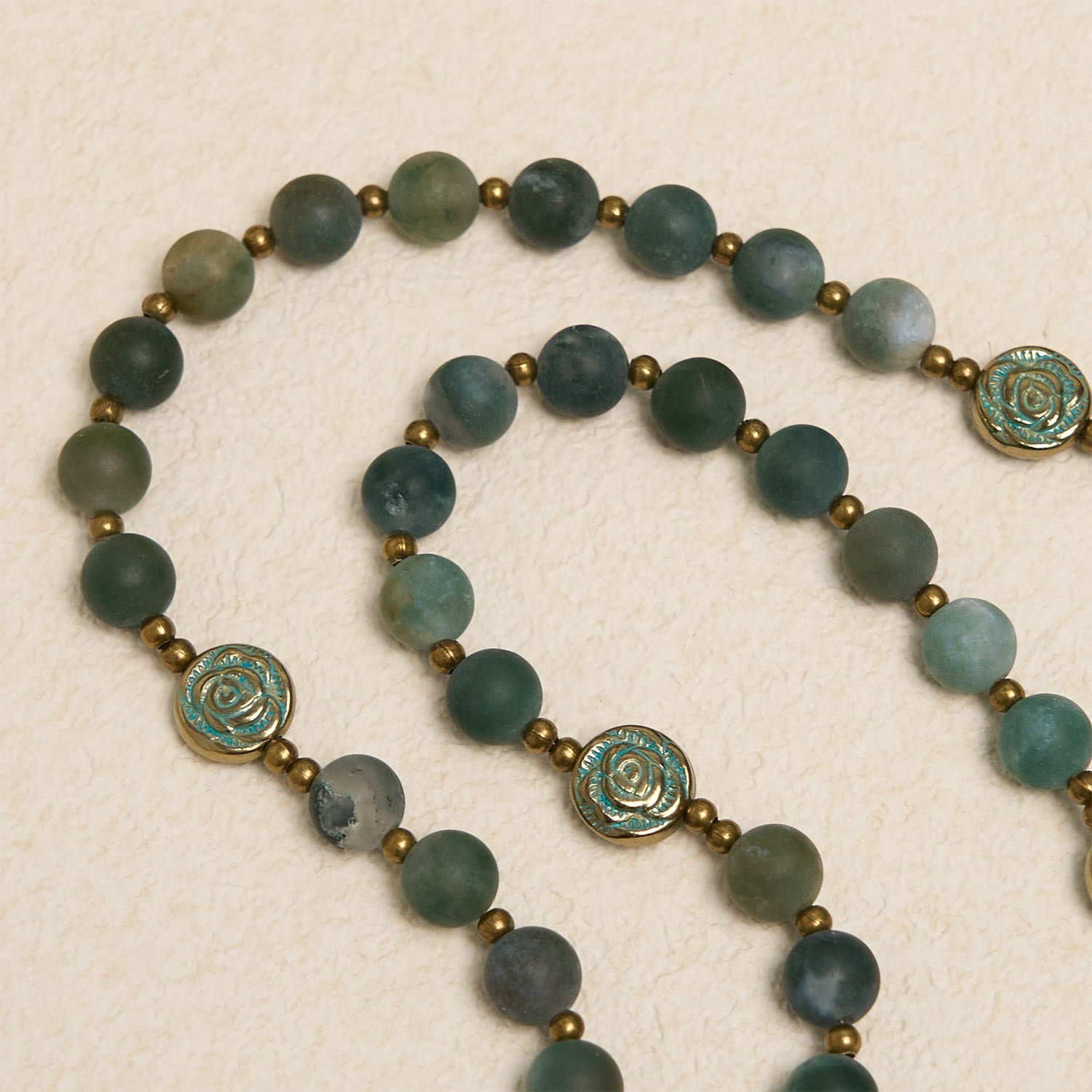 Christianartworkshop Green Agate Prayer Rosary with Bronze Rose Accents: A Sacred Journey of Healing and Faith