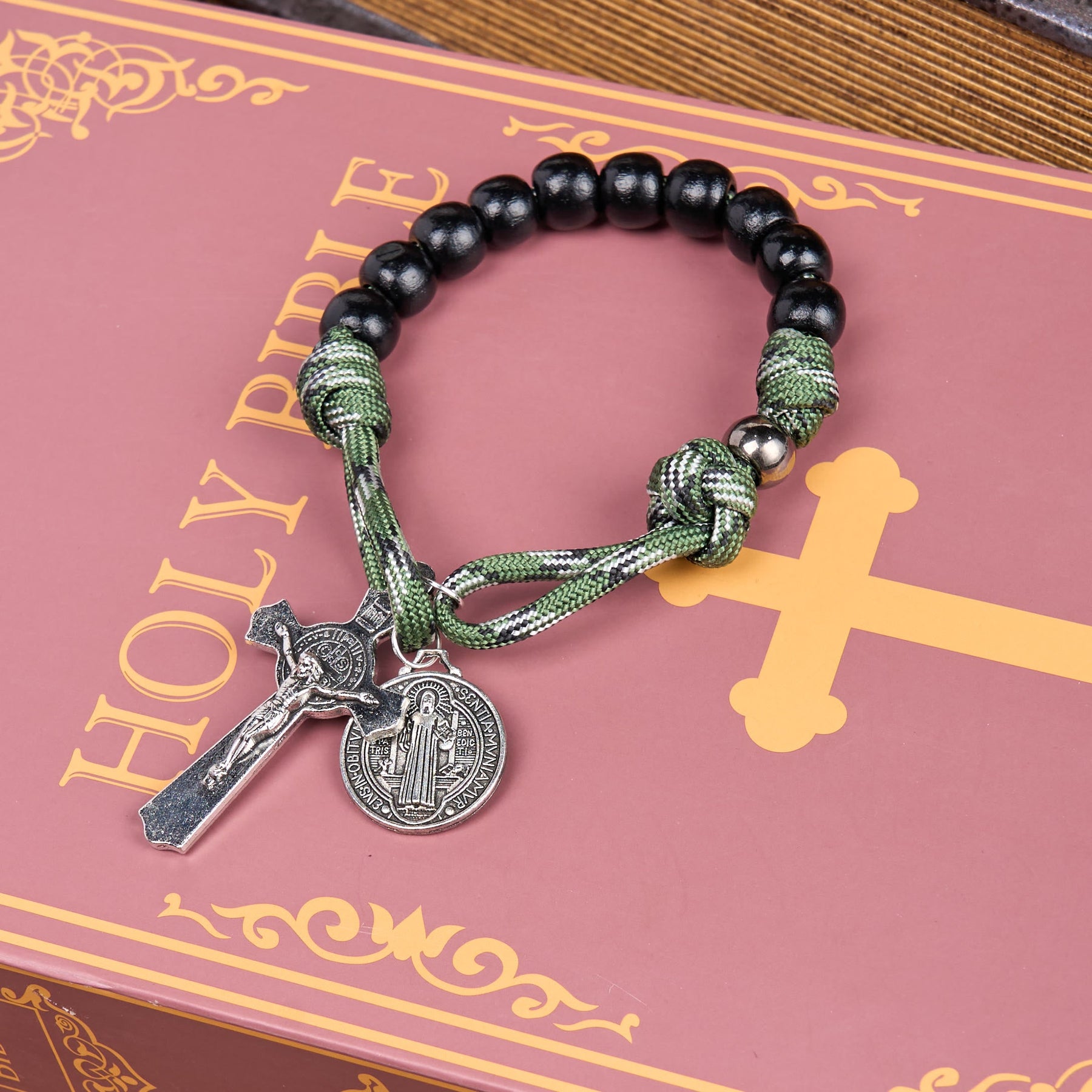 Christianartworkshop St. Benedict Medal & Crucifix of 10 mm Round Black Wood Green Paracord Pocket Rosary