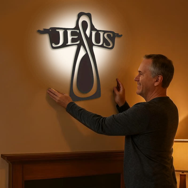 Featuring a creative fusion of the cross and the word “JESUS”, this wall art radiates sacred reverence—inviting reflection on faith’s core and spiritual connection. The sleek interplay of shapes captures devotion’s essence, bringing a dignified, uplifting presence to any space.