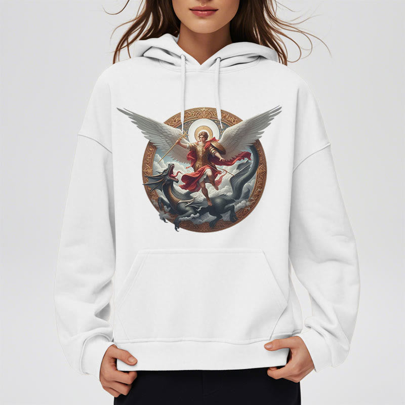 The hoodie features a captivating image of Archangel Michael triumphantly defeating the dragon, a symbol of overcoming evil. Encased within an ornate circular frame, this detailed illustration radiates power and divine glory. The design magnificently captures the essence of courage, protection, and the ultimate victory of good over evil.