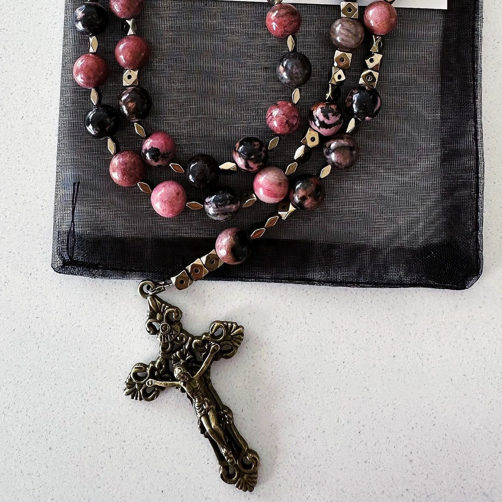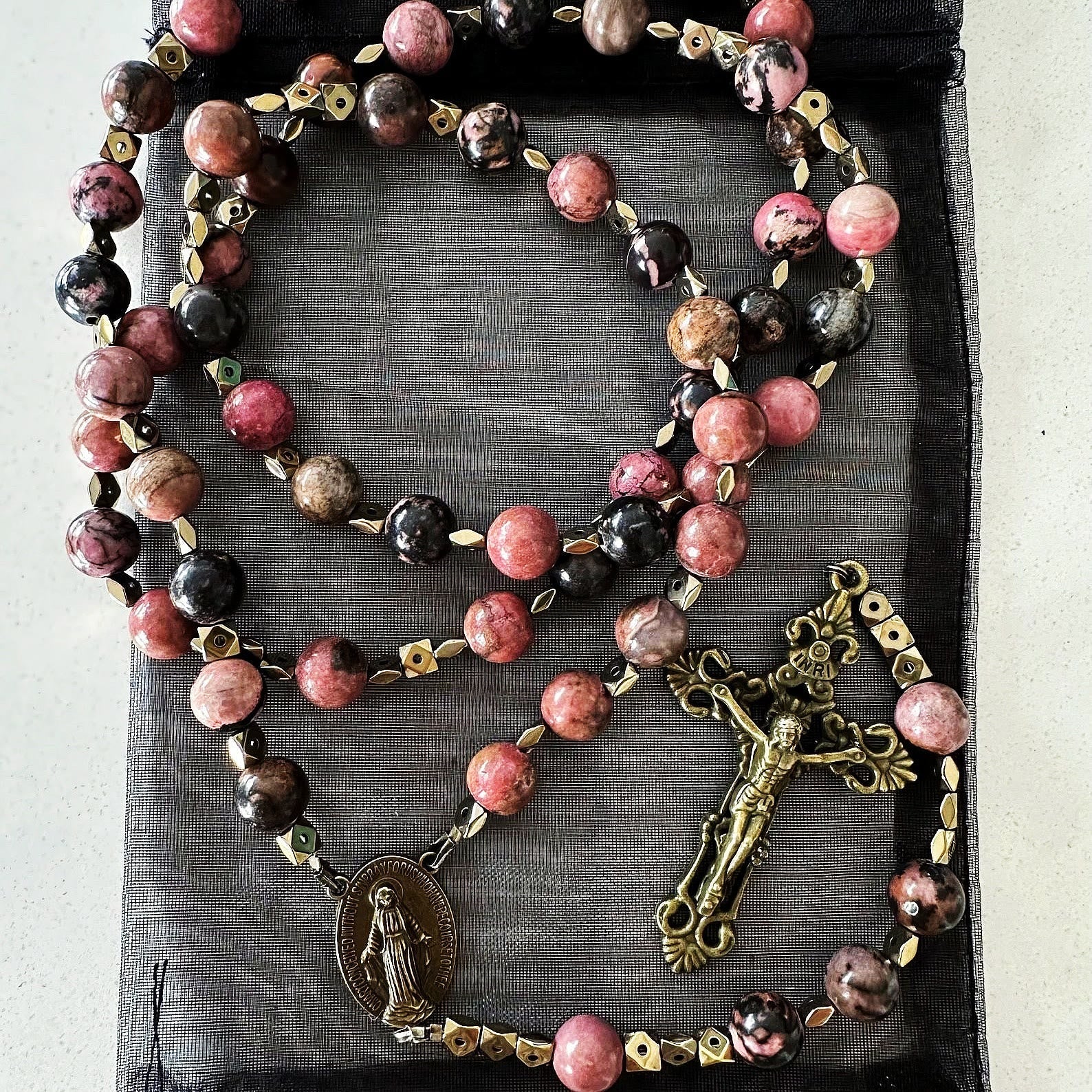 Each bead in this rosary is meticulously handcrafted, featuring rich, earthy tones of pink and brown. The smooth texture and natural beauty of the beads provide a comforting touch as you move through your prayers. The combination of colors not only enhances its visual appeal but also adds to its symbolic depth.